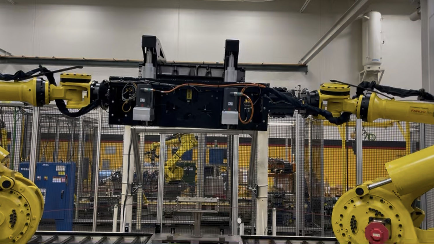 This operation was previously performed using dual industrial robots with a shared end-of-arm tool (EOAT) that clamped onto the engine block during the flip.